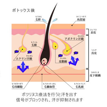 ボツリヌス療法を行うと汗を出す信号がブロックされ、汗が抑制されます。